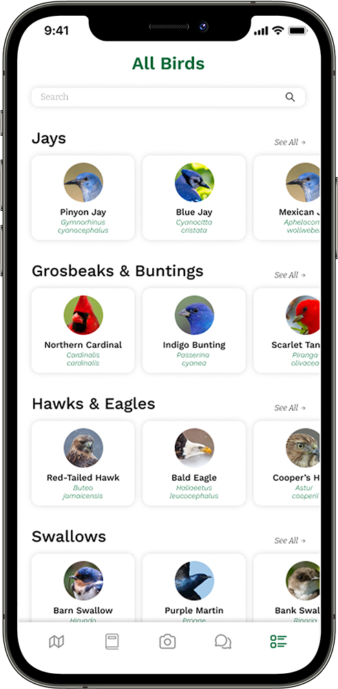 With branding established and structural testing complete, I moved into the high-fidelity design phase, refining the prototype into a polished and realistic app experience. Visual hierarchy, contrast, and spacing were carefully tuned to enhance readability outdoors, a key context for birders using the app in the field.